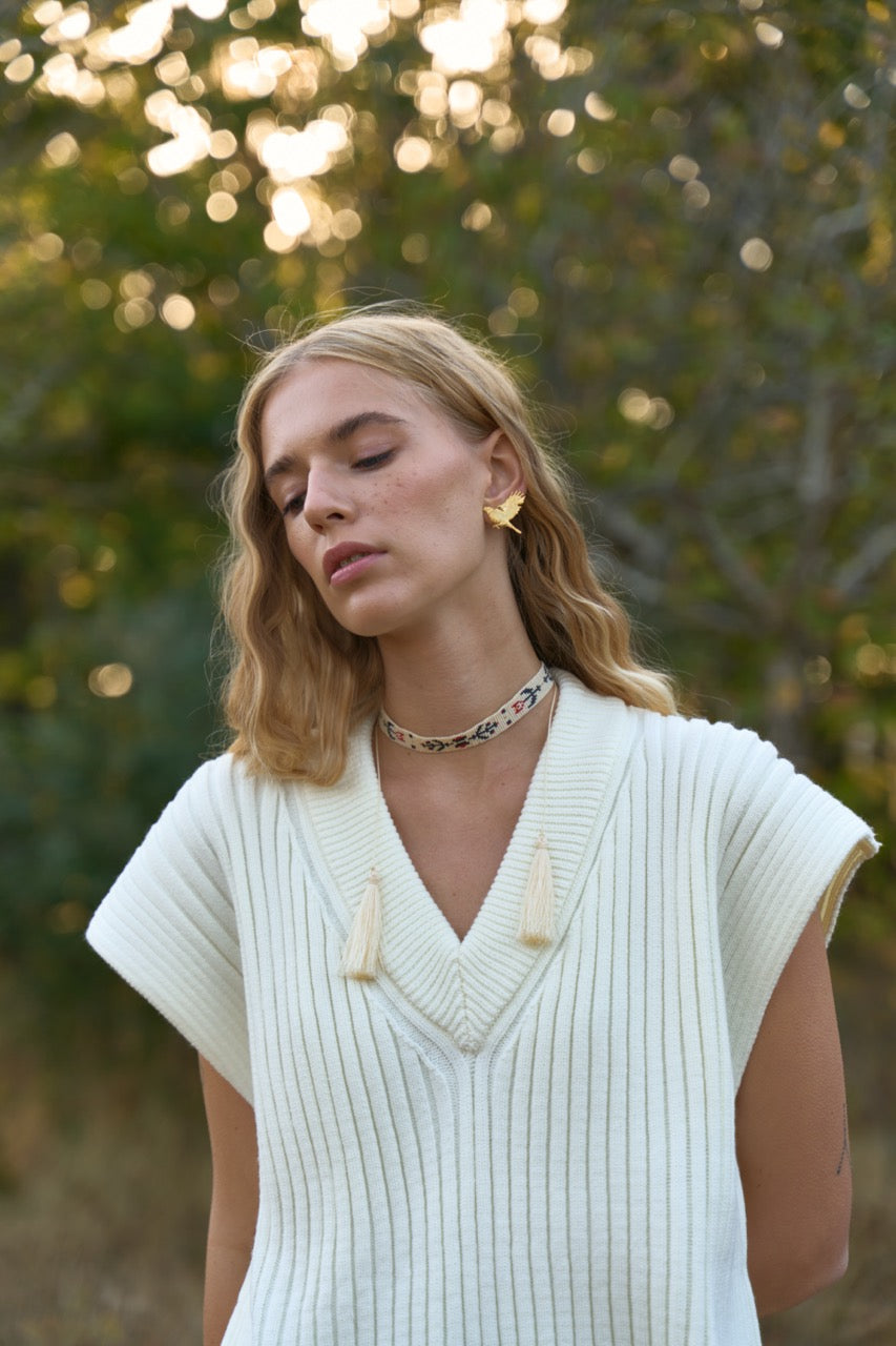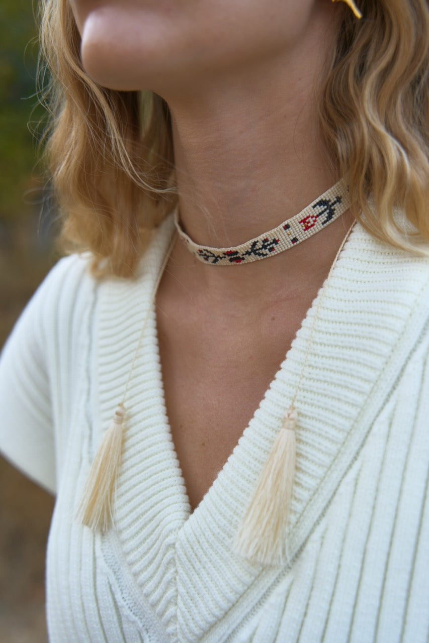 A modern take on the traditional Ukrainian necklace, this handcrafted herdan is made with fine Japanese seed beads and finished with sterling silver hardware. The tassels are removable and made from durable bead thread that won’t fade when exposed to water — giving you the freedom to style it your way.