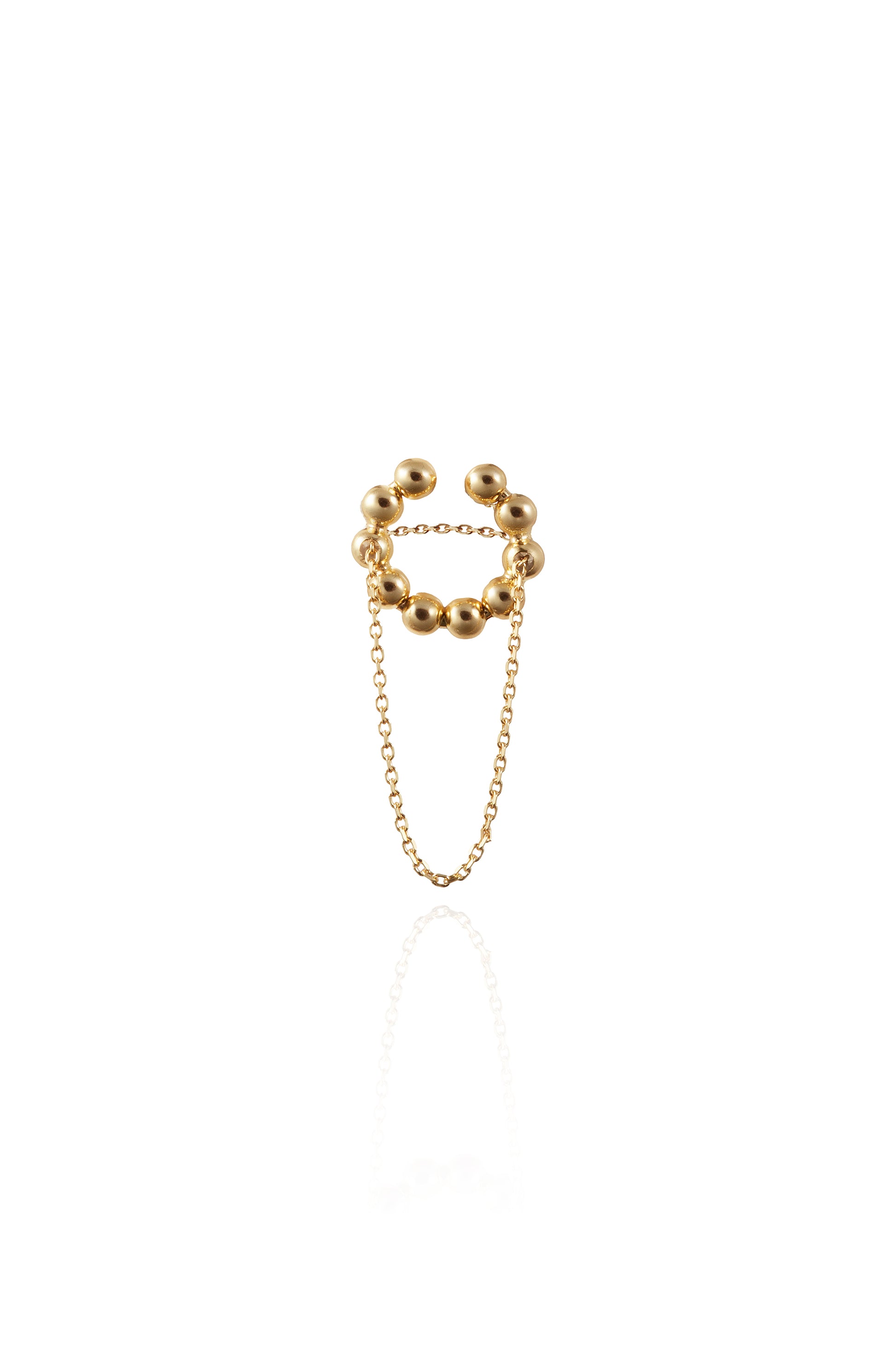 The Sierra Cuff-Ring is a convertible design crafted from gold-plated 925 sterling silver, featuring polished spheres and draped chains. With its innovative sliding mechanism, this piece can be worn as a bold ear cuff or a modern open ring — adjusting seamlessly to your style and mood.